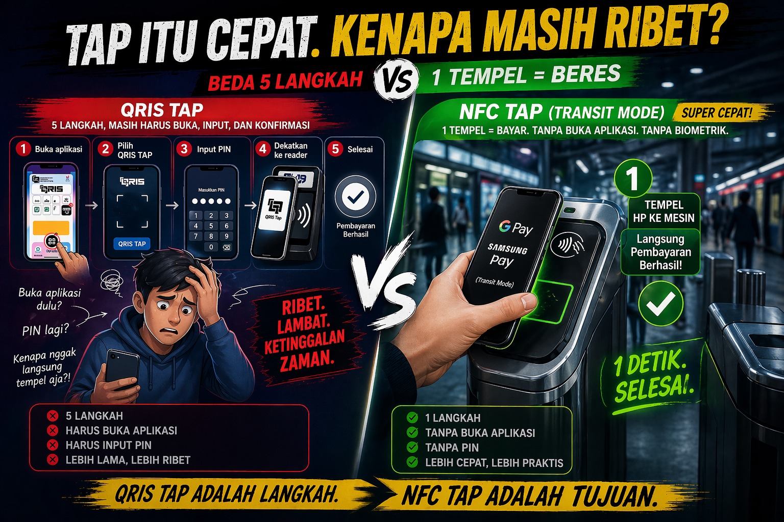 | Cara pakai | Buka app → input PIN → tap dalam 1–2 menit | Langsung tempelkan ponsel, selesai |